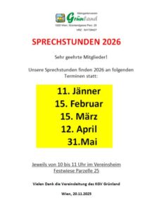 Unsere Sprechstunden 2025 finden zu folgenden Sonntagsterminen statt: 26. Jänner, 23. Februar, 30. März, 27. April und 25. Mai– jeweils von 10:00 bis 11:00 Uhr im neuen Vereinsheim auf der Festwiese.